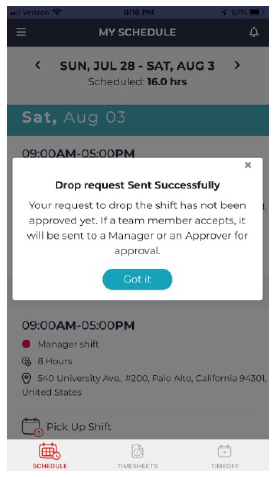 - You will then be shown a message letting you know if your shift has been successfully dropped but has not yet been approved. If a team member you selected approves the shift, it will be sent to an approver or manager to accept.