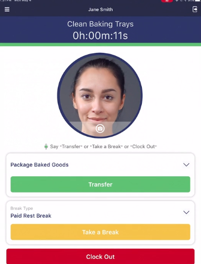 At the end of a break, and to resume work, a user may say either “End Break”, or “Resume Work.”To clock out at the end of a shift, a user may say either Clock out" or "End shift".