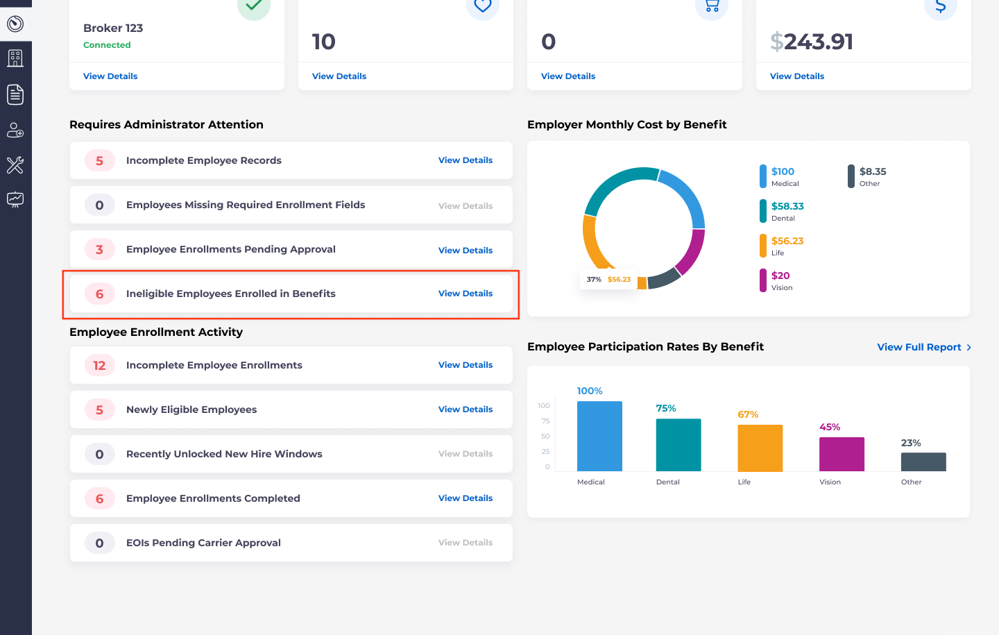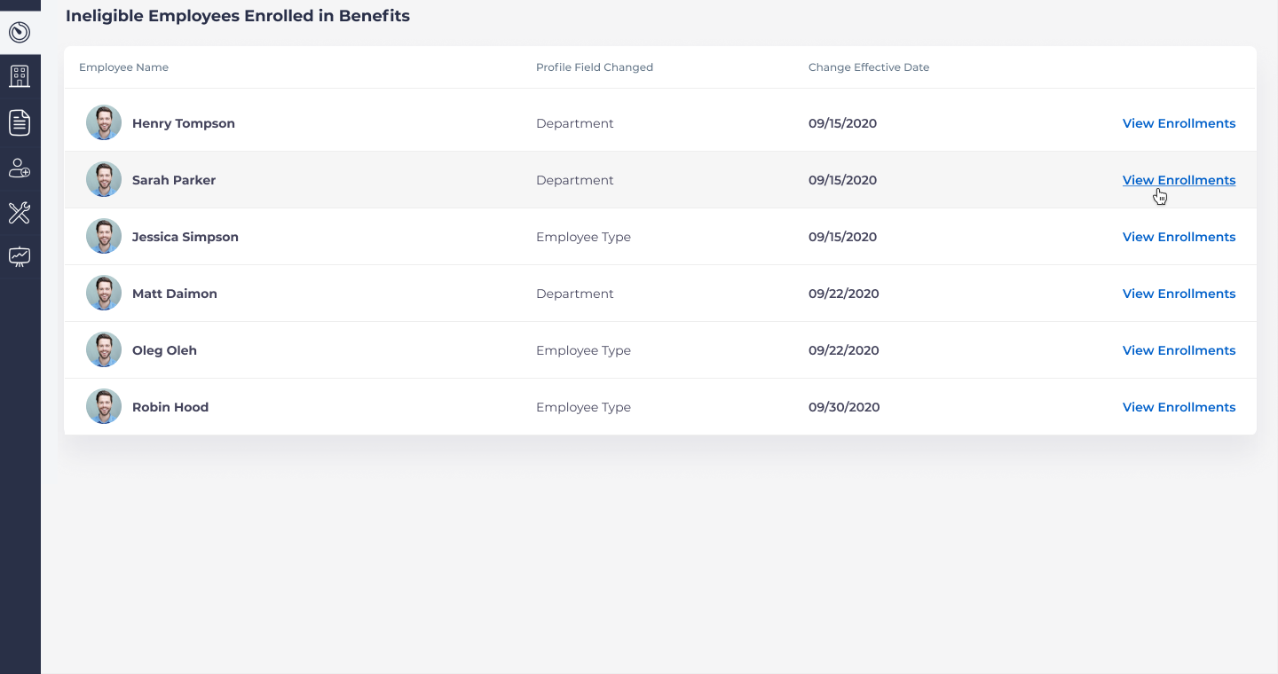 This page will display a column which displays which profile field changed for each employee, and another column which displays the date that the change was made. If you click “View Enrollments” this will take you to a separate page which will enable you to review and manage the employee’s eligible benefits: