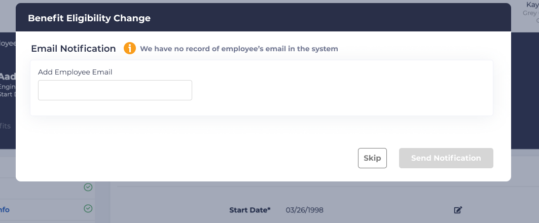 If a newly eligible window is being opened, and the option to send an email has been selected, but no email address has been set for the employee, a modal window will appear providing the option to enter an email address for the employee.