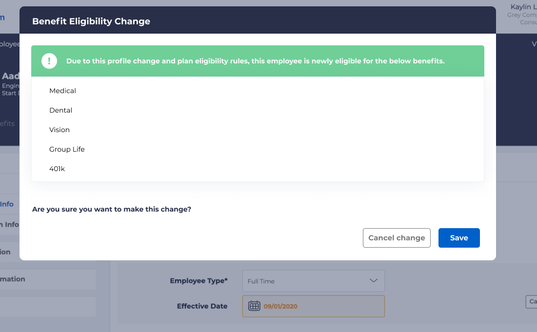 On the left side of the modal window, it will display a list of plans for which an employee is newly eligible. Two options will appear on the bottom: “Cancel change” or “Save.” If “Cancel change” is selected, then the changes to the employee’s profile will not be changed. If “Save” is selected, a new popup modal will appear with the following information:
