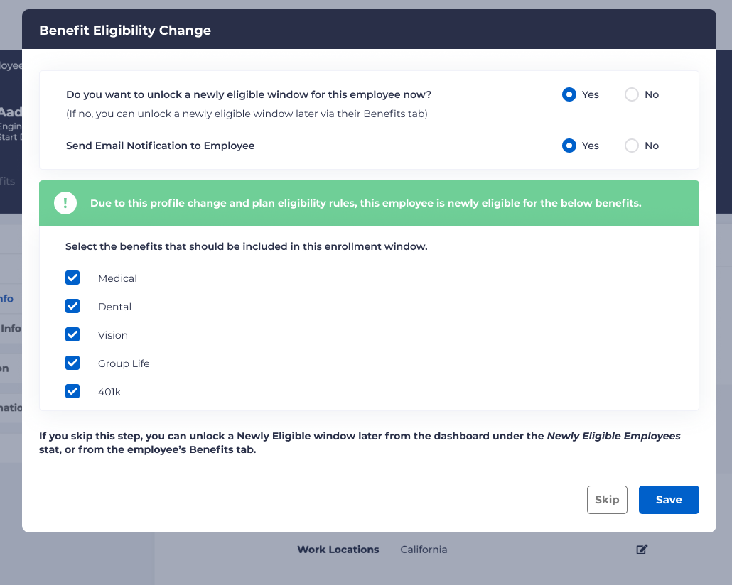 On the bottom of the modal, two options are provided. The first option is to “Skip,” which will take no action. If this is chosen It will still be possible to manually open an enrollment window from the dashboard under “Newly Eligible Employees.” The second option, “Save,” will apply any of the above selected options, and take corresponding action.