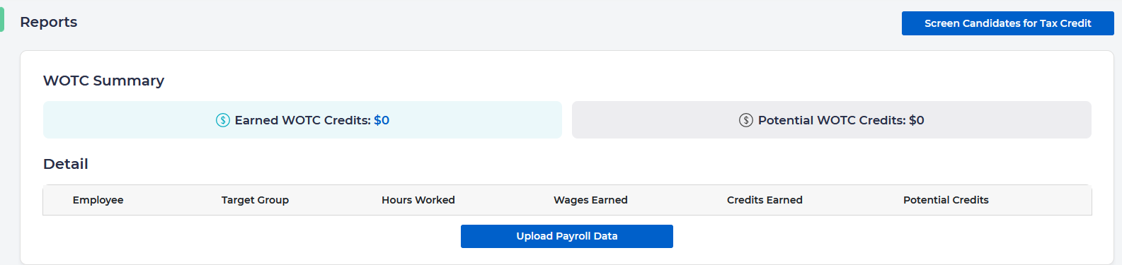 Enables the employee to view a report of any earned WOTC credits, potential earned credits, and detail about the employee, target group, hours worked, wages earned, credits earned, and potential credits