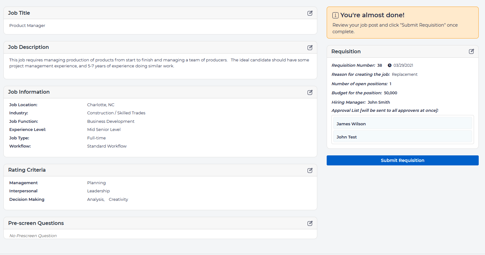 On the third and final page you can review your job requisition and the information you have entered. You may change any section of this by clicking on the relevant edit icon.