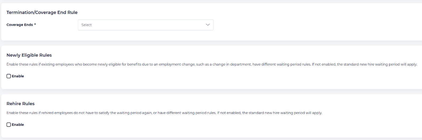 - Newly Eligible Rules (if there are differences from standard new hire waiting periods)