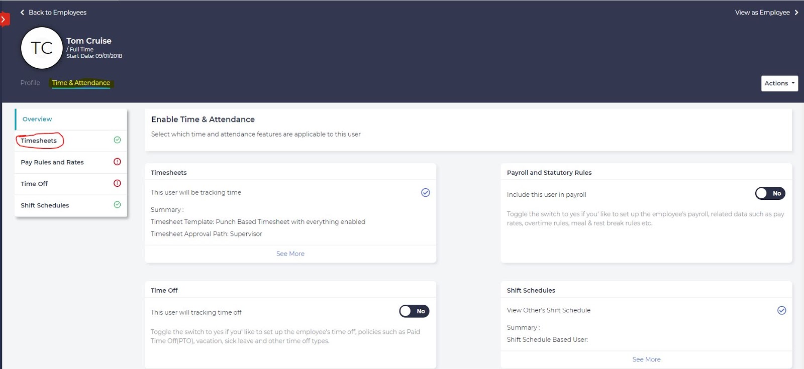 - On the employee profile, go to the following section: Time & Attendance -> Timesheets.