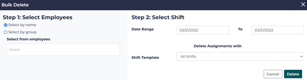 Either Select Employees by name or by group, choose the date range for the shifts you wish to delete, and either choose All Shifts or a specific shift from the dropdown menu.
