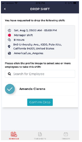 - You will be automatically navigated to the “Drop Shift” page. Select the person you wish to cover your shift. There is no limit on the number of employees you can select.