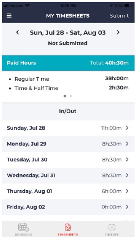 - Tap on the date “>” arrow mark to view the details of what hours you punched throughout the week.