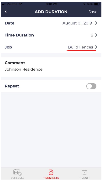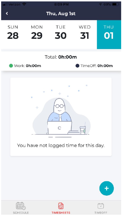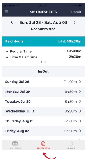 - Tap on the Timesheet icon on the bottom menu bar.