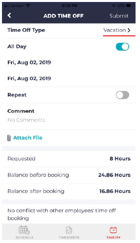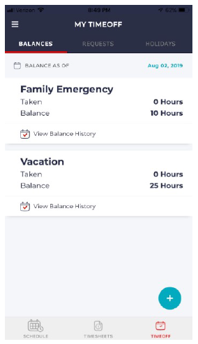 - Tap on the Time Off icon on the bottom menu bar.