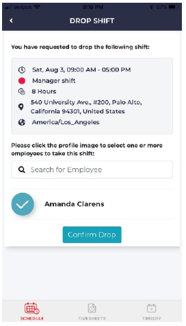 - You will be automatically navigated to the “Drop Shift” page. Select the coworker(s) who you want to pick up your shift. There is no limit to the number of people you can select.