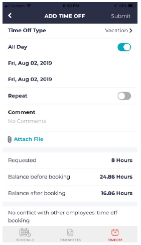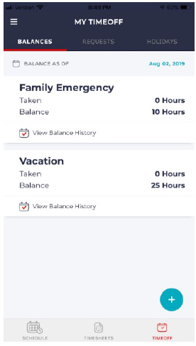 - Tap on the “Time Off” icon on the bottom menu bar.