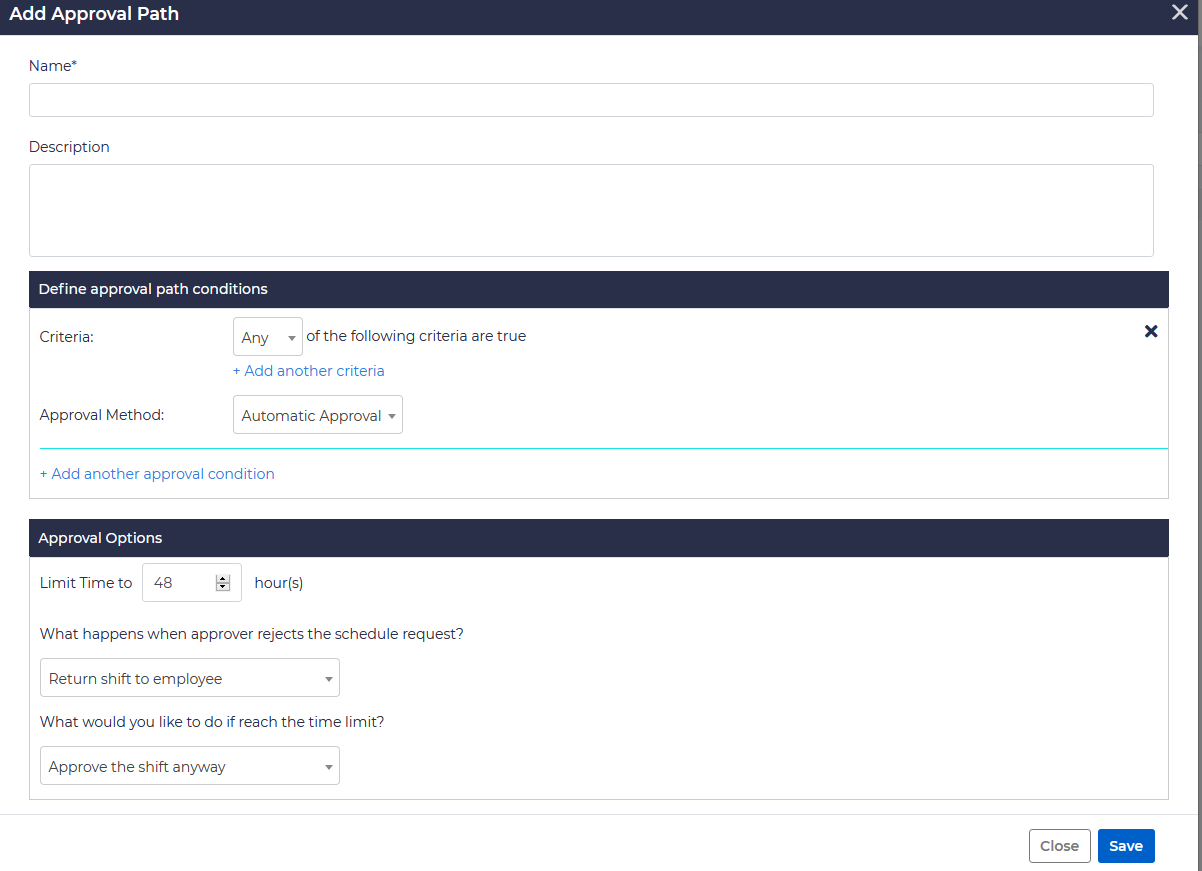 Here you can set the name of the Approval Path (e.g. “Hourly non-exempt employees”) and a description.