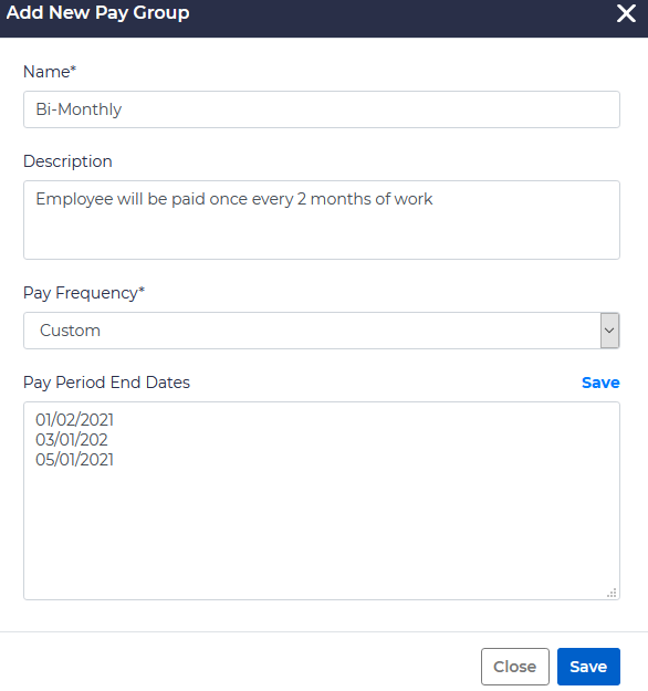 You have the option of creating a non-standard pay group by choosing Custom. After doing so, enter a name and description of the custom frequency, and then enter any custom dates associated with this pay group. For example: