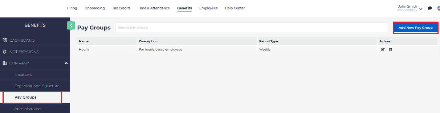 To access Pay Groups, from the left menu, choose Company and then Pay Groups. Here you will see a listing of all of the existing pay groups. Remember, every company has at least one pay group for Benefits to function properly.