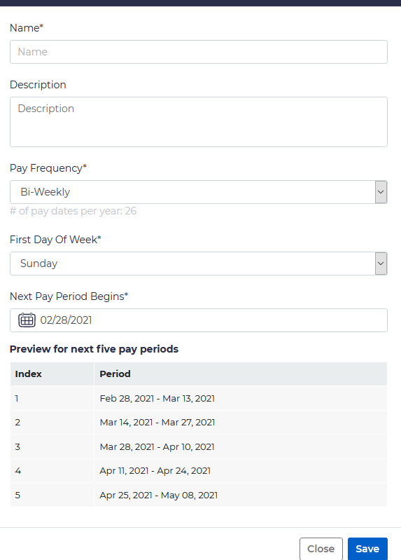Choose an appropriate pay frequency, identify the first day of the pay week, and enter the date for when the next pay period begins. You will then be shown a preview for the next five pay periods.