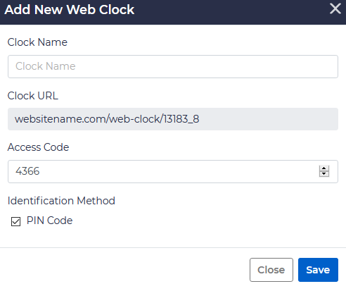 You will be provided with a new URL to access your web clock. On the Kiosk or computer where you have this set up, please navigate to this URL. The Access Code will enable you to access the clock to set it up for employees to login with their PIN code.