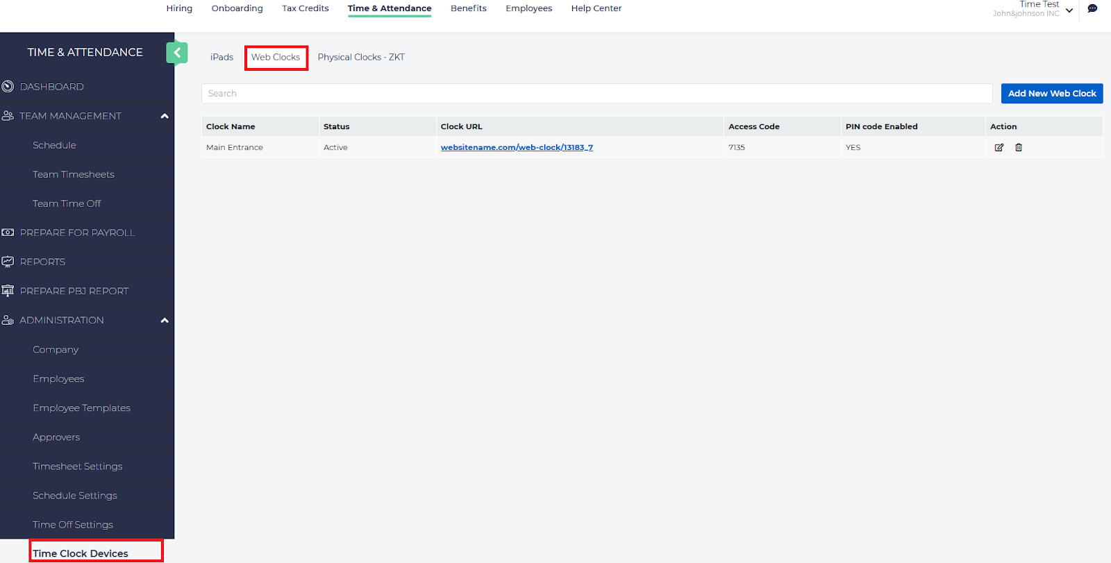 Under the Administration menu, choose Time Clock Devices. Then choose the Web Clocks tab.