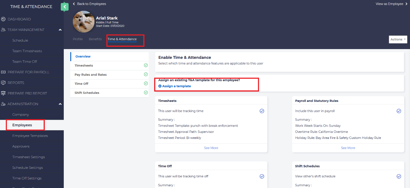 To use a template for a specific employee, go to Administration – Employees and select the employee you wish to update. Then choose the Time and Attendance tab and select Assign a template.