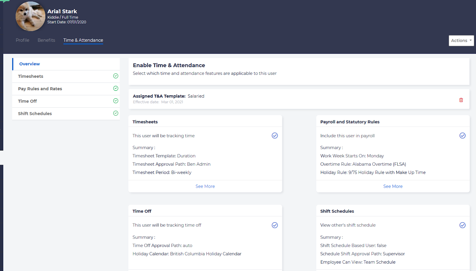 You can then review the various settings that were set according to the template, by viewing the tabs on the left. You may see a summary of all of the settings on the Overview tab, and you may see more details on each of the other Timesheets, Pay Rules and Rates, Time Off, and Shift Schedules to see how these settings have been applied.