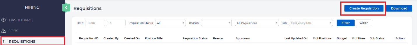 From the left menu, choose Requisitions and then click on the Create Requisition button on the upper right.