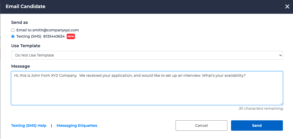 Messages can be sent via either email, or SMS if you have SMS enabled. Messages between your company and the candidate will be tracked through the Messages page.