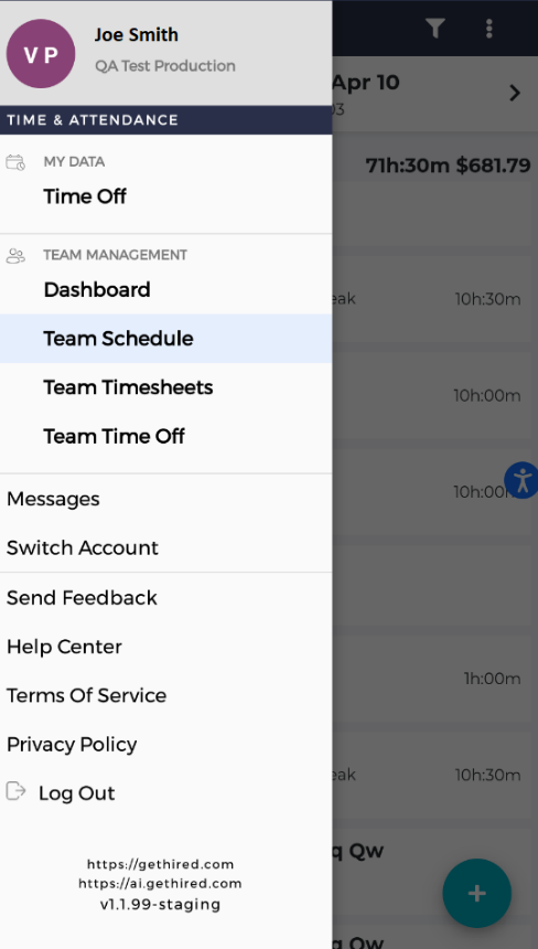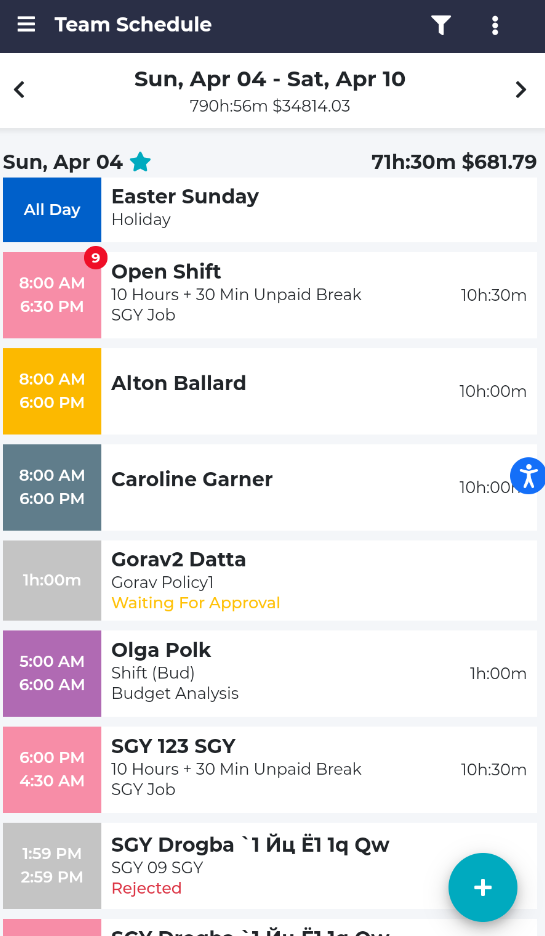 By clicking on the arrow “>” on the right, you can see more details about the employee’s schedule. If you click on the small icon on the lower part of the screen, you can see more information about where the person was when they clocked in.