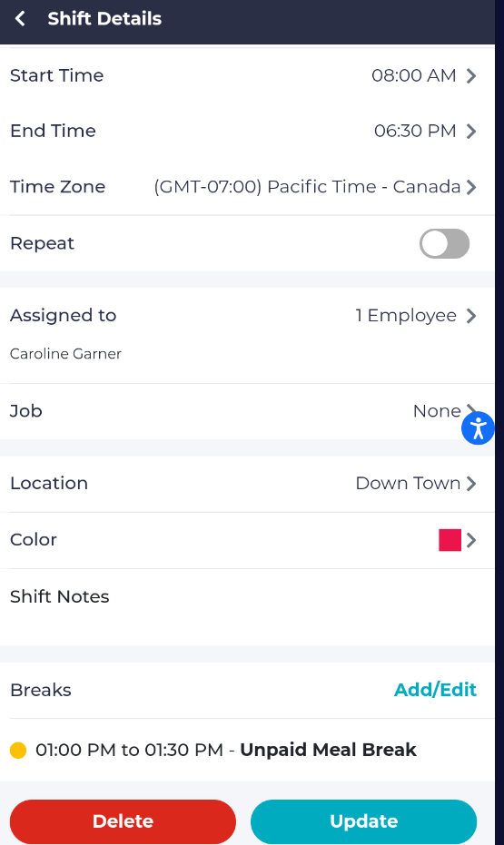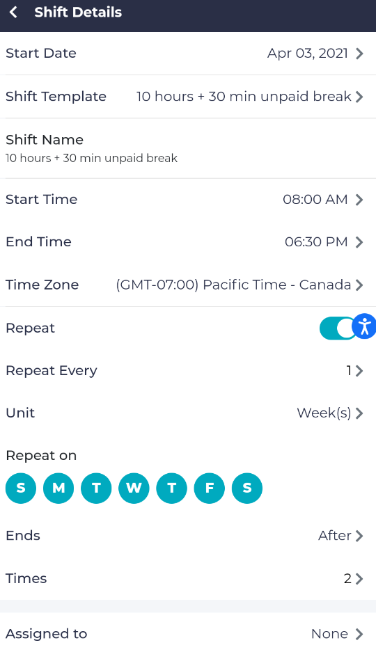 You may set the start time, end time, and time zone, and then identify if you would like this shift to repeat. You can then assign the shift to one of your employees, and they will be notified and scheduled.