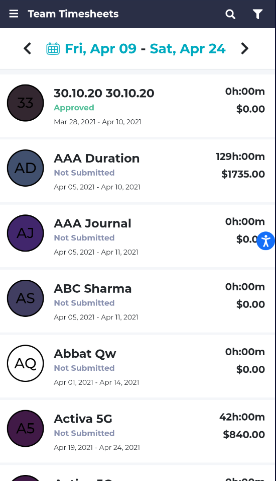 From the menu, if you choose the Team Timesheets view, you can see a list of all of the timesheets in all statuses.