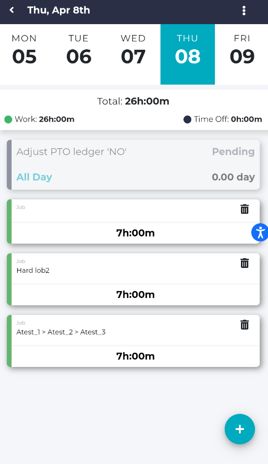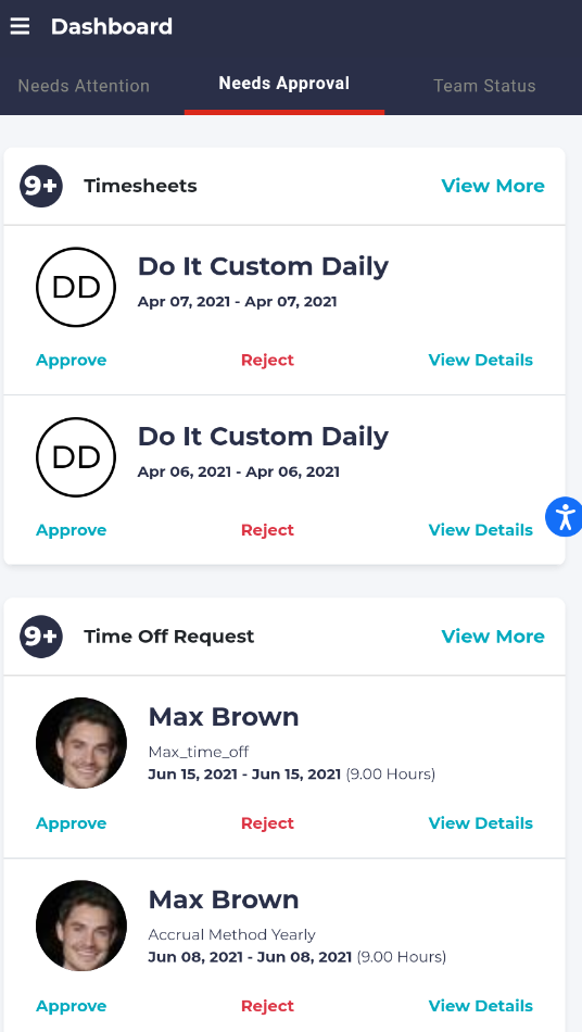 On this page, you can see the details, approve, or reject the timesheets and/or the requests.