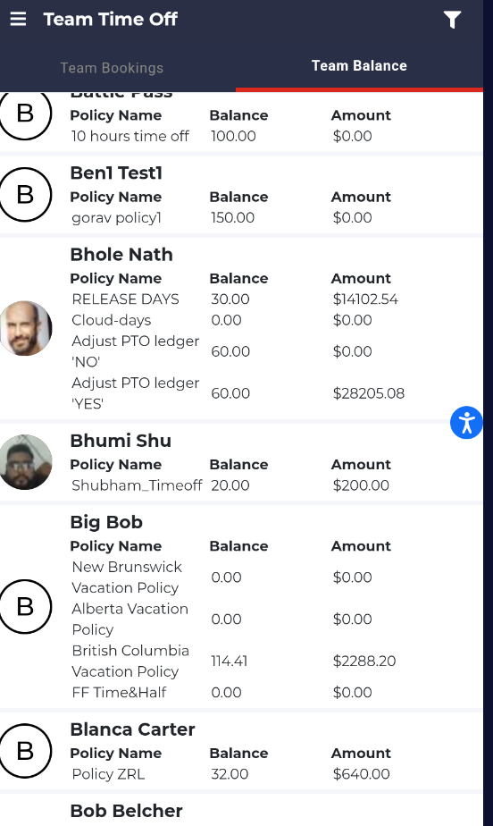 By choosing the Team Balance tab, you can get a glance at the time off balances for your entire team.