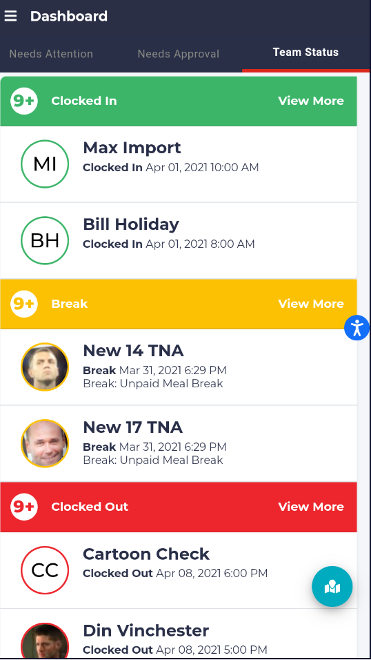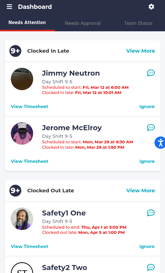 On this screen you will immediately see any logins that require your action. These will be divided into sections including “Clocked in Late,” “Clocked out Late,” “Not Clocked In,” “Not Clocked Out,” “Did not Start their Break”, “Outside the Geo-Fence,” “Open Shifts,” and “Unpublished Shifts.”