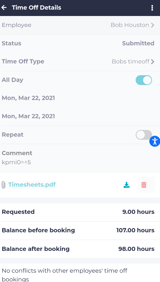For each booking you can click on its block to get detailed information about each time off request and take action.