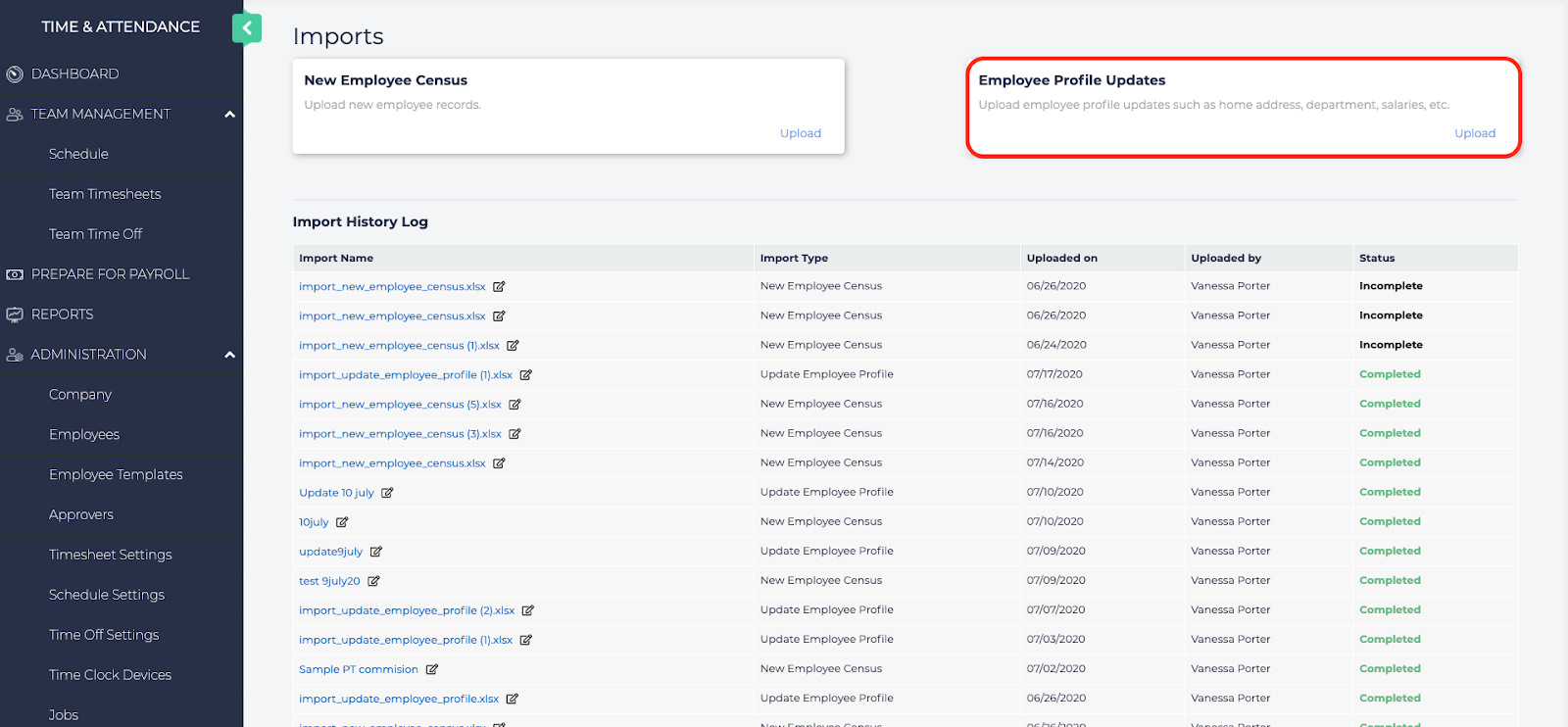 The Team Timesheets Import feature helps users quickly update timesheet data for employees. Users create a CSV file based on the Timesheet Template they are using, fill in the appropriate data, and upload it into the Time and Attendance system. This saves time when there are many employees to update rather than access each Employee’s Timesheet page individually.