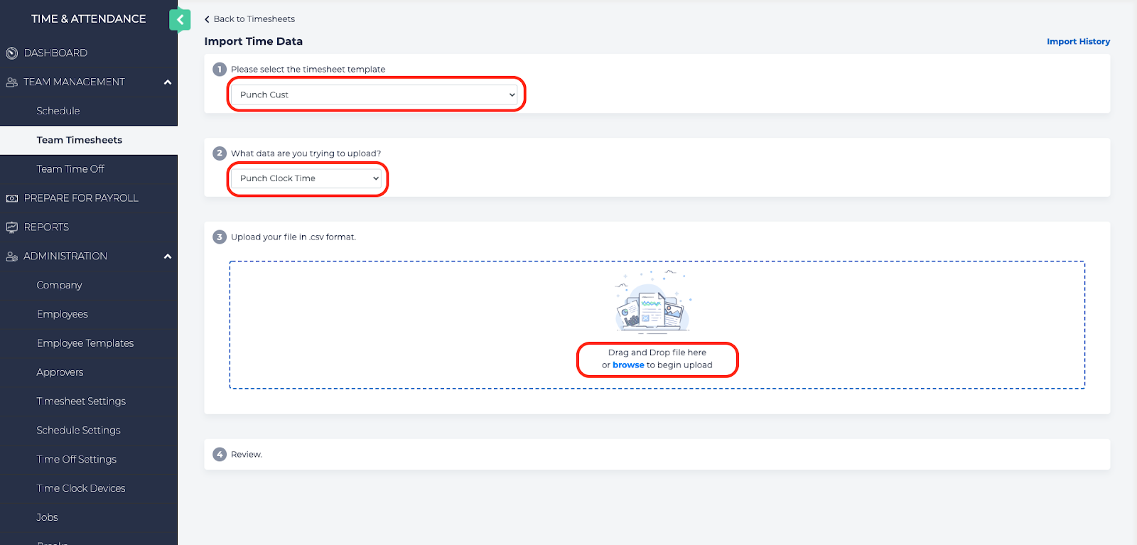 When the CSV file is uploaded, the next step is to review it. This matches the fields from the CSV file against the Time and Attendance fields. Use the following steps.