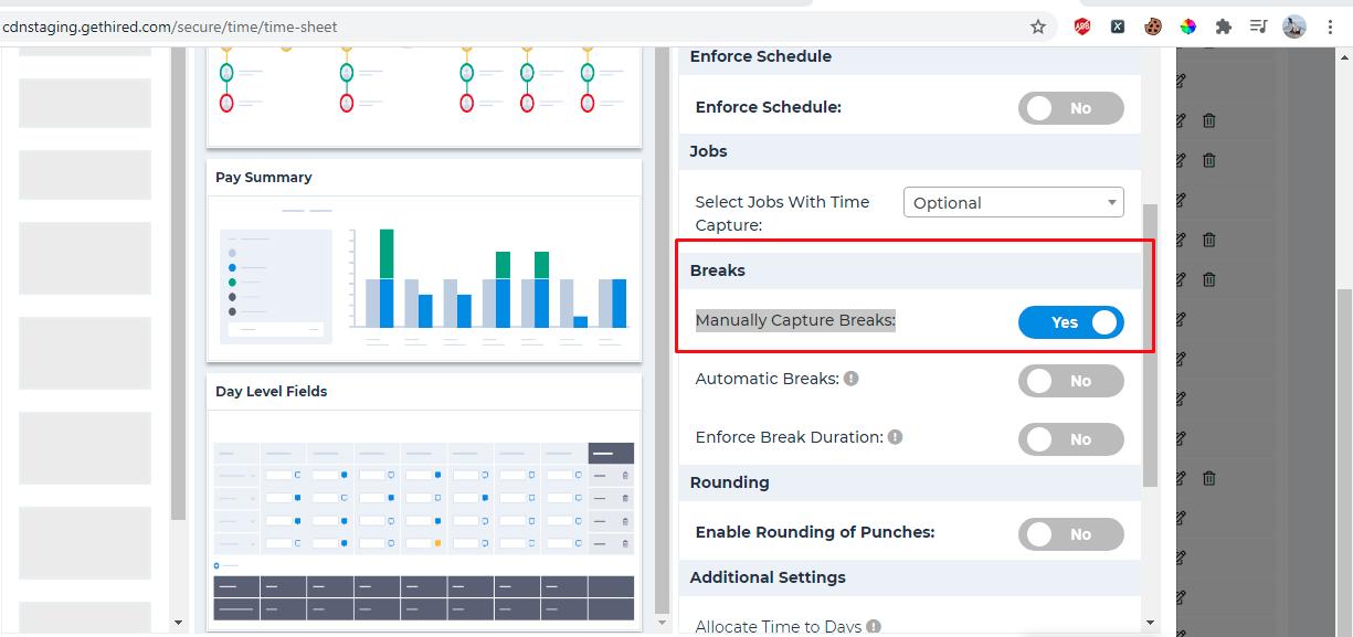 - If the Timesheet Template has the Breaks > Manually Capture Breaks set to Yes, then the Break field is Required.
