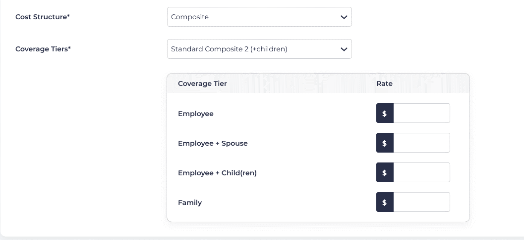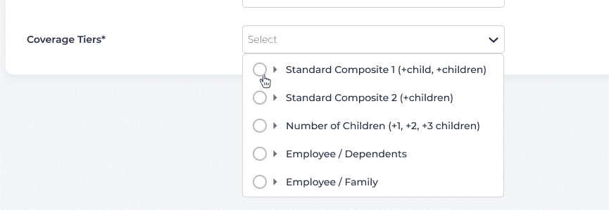 Each coverage tier will provide different options, depending on which selection you have made. For instance, if Standard Composite 2 (including multiple children) is chosen, then options will be displayed for the rate for the employee, employee plus spouse, employee plus children, or for the entire family.
