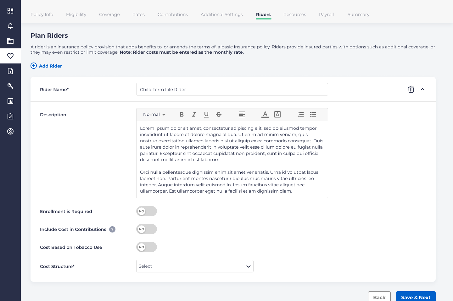 Enter a Rider Name and a Description. These fields will show to employees during the enrollment process.