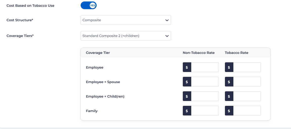 Once you have selected the coverage option, you will see the tiers and rate settings below: