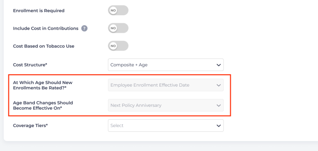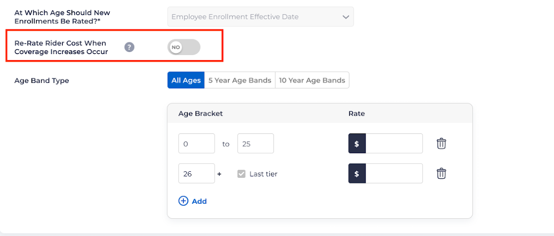 For Life/Disability plans, if the plan does have age-based rates and Issue Age = Yes, then the Age Band Changes Should Become Effective On field will be replaced with a toggle field for Re-Rate Rider Cost When Coverage Increases Occur