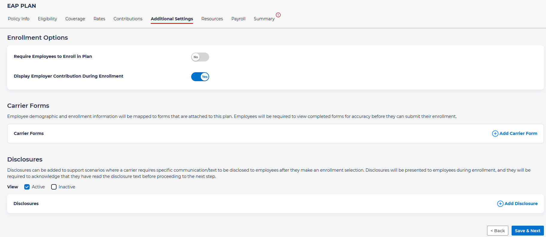 Set up any additional settings, such as whether employees are required to be enrolled and attach any carrier forms and disclosures:
