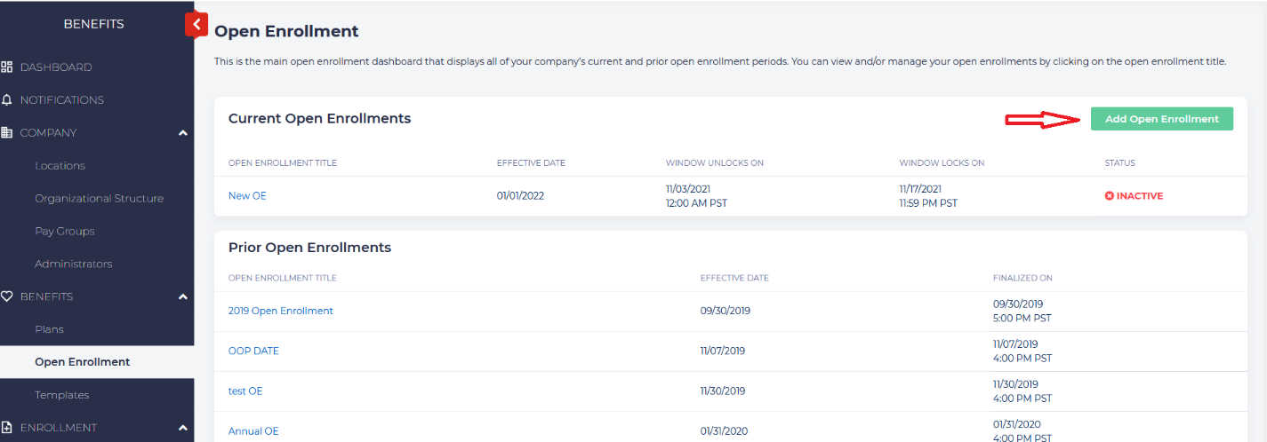 This page will provide you with instructions for how to set up Open Enrollment (OE) for your employees. Once OE is set up, the system will automatically trigger an open enrollment period for all employees based on the OE date. For new hires, newly eligible, or for a QLE window for a specific employee, you will need to manually open that window for that employee. To set up a new Open Enrollment, or if you wish to view or edit any past OE, go to Benefits – Open Enrollment. Click on the Add Open Enrollment button. You will see a screen that looks like this: