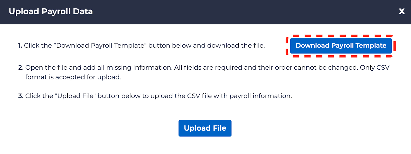 - Select Download Payroll Template. This will download a CSV file. Open it in your preferred spreadsheet program such as Microsoft Excel or Google Sheets.