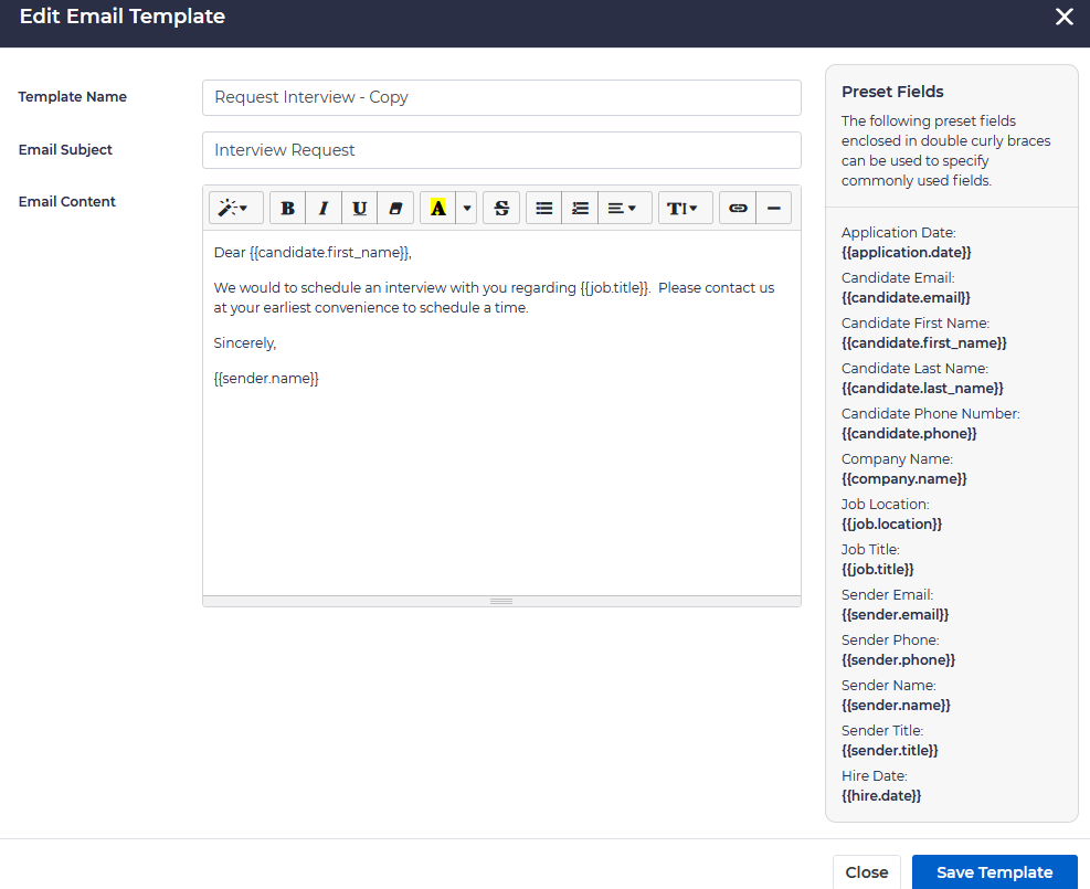 This enables the employee to access, and edit any internal email templates, including those for internal employees and also those for potential employment candidates.