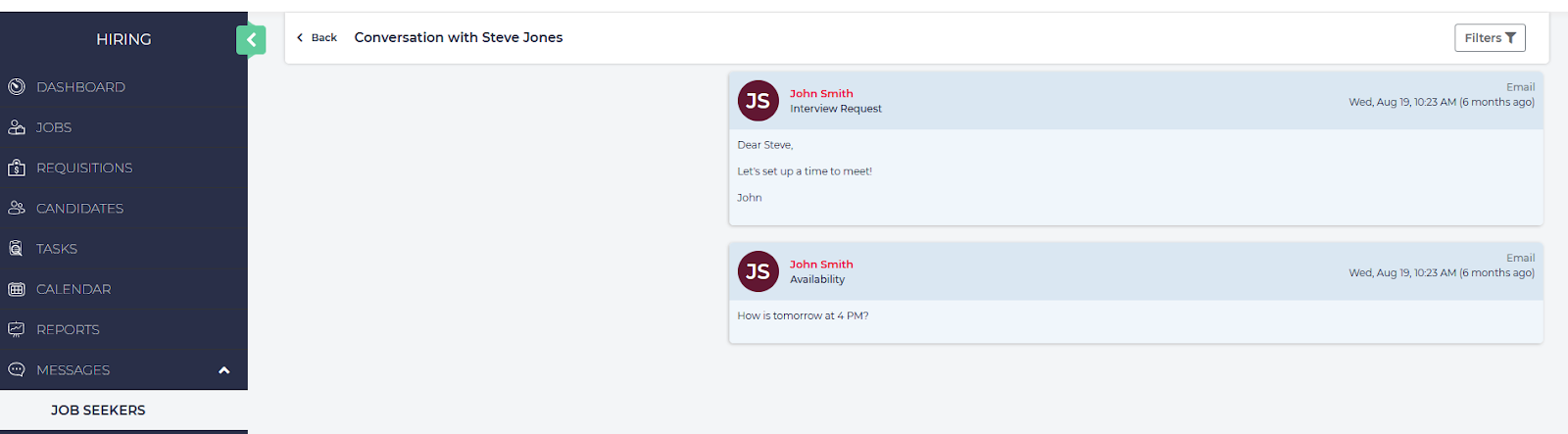 This allows access to any internal messages within the system to any candidate, found under the Messages section of the Hiring Dashboard.