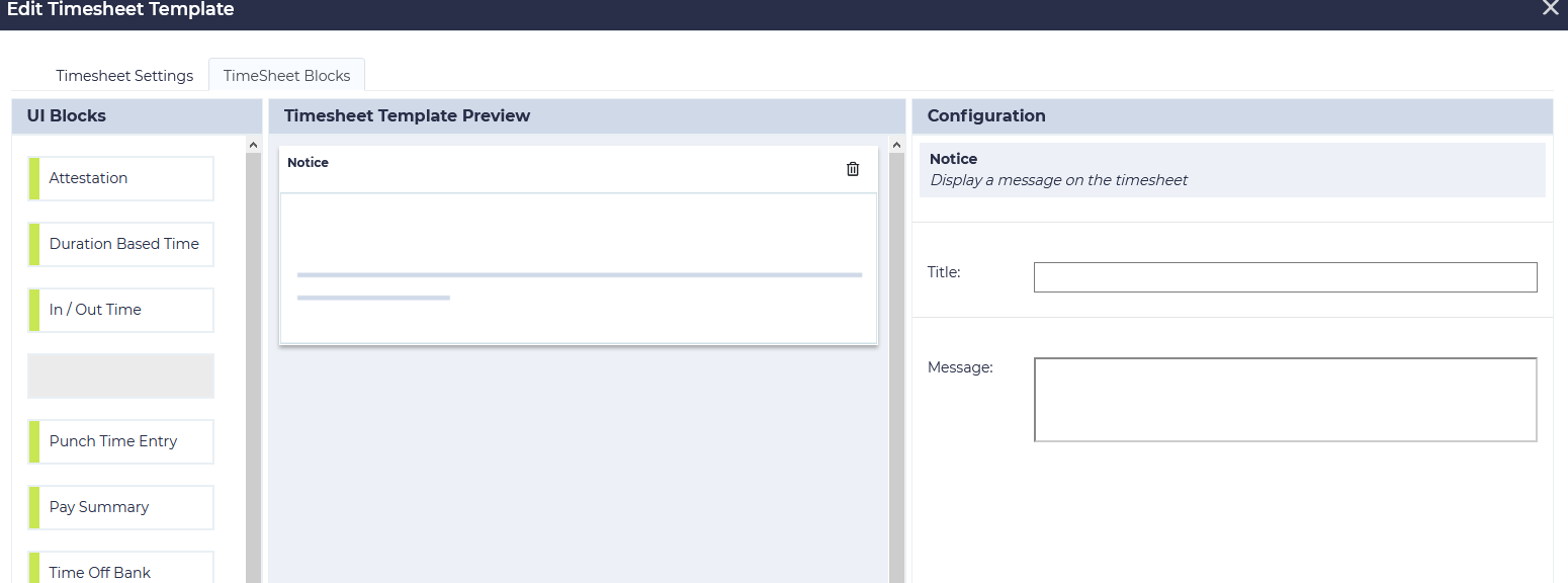 The Notice block displays a message on the timesheet. You can add the title of the message and its text: