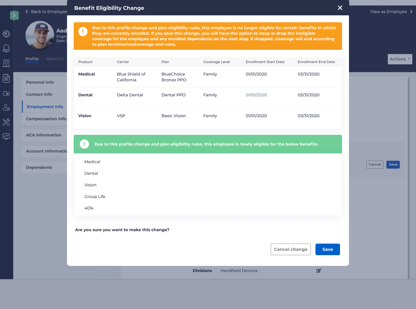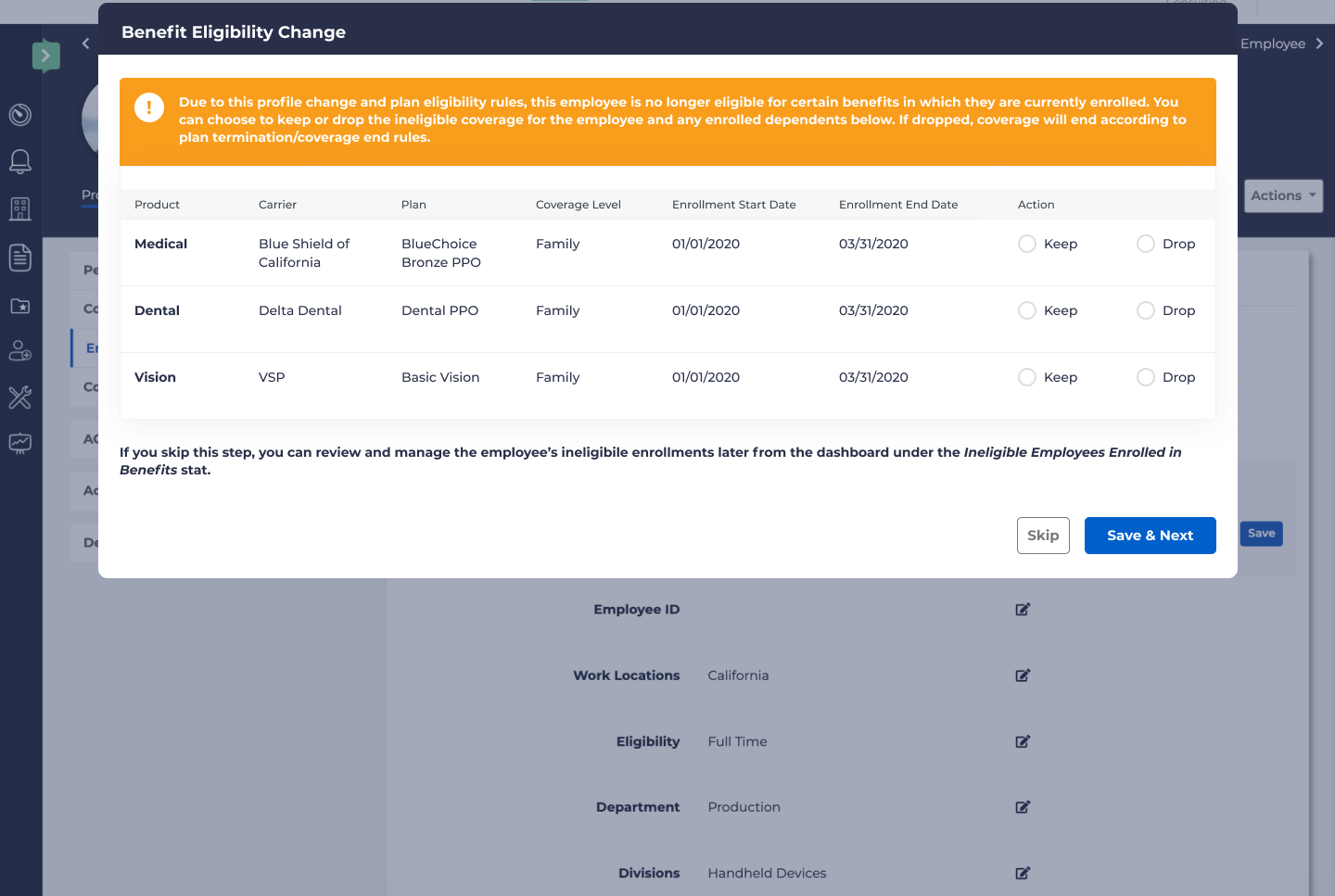 Occasionally, changes to an employee’s profile may result in an employee losing eligibility for a product in which they are currently enrolled, but also can result in them becoming eligible for new products.