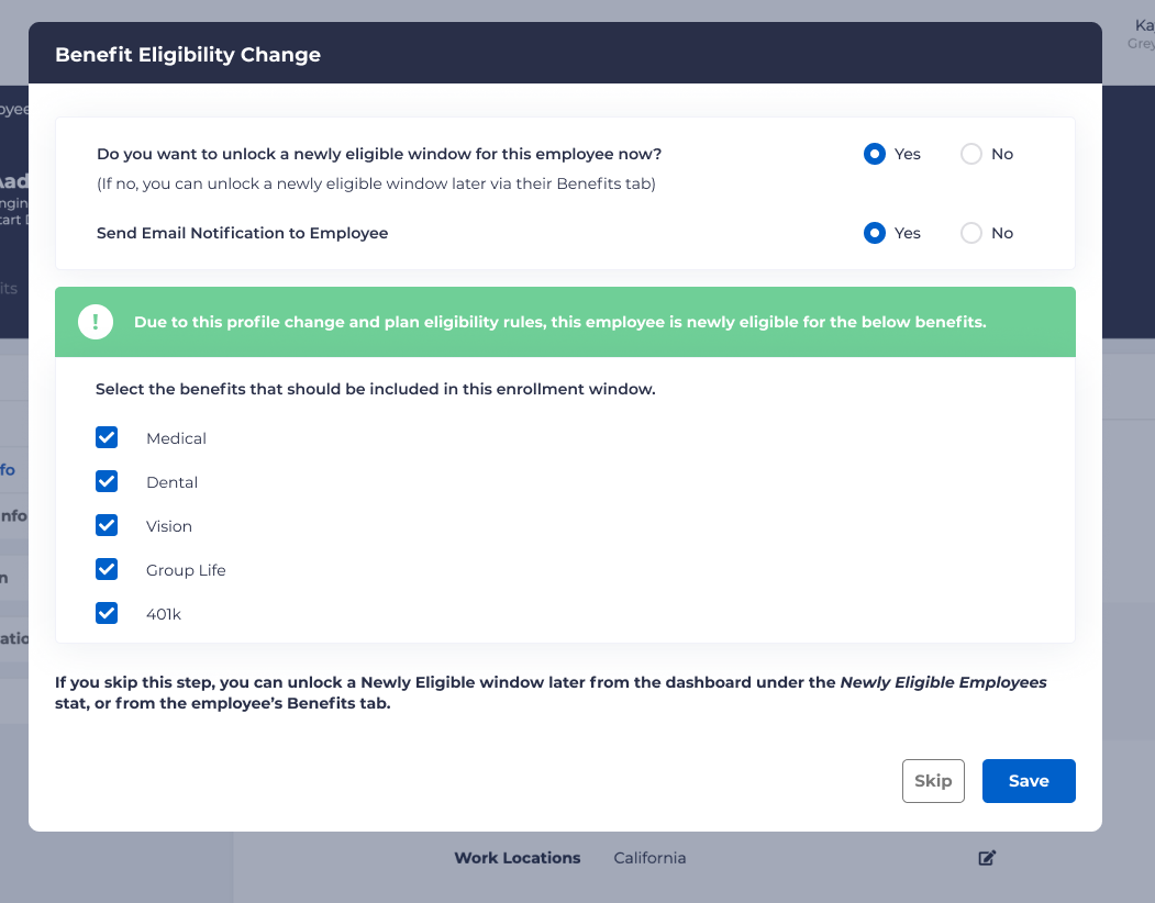If you select “Save” or “Skip” it will display the following screen, which is the same as when an employee becomes newly eligible.