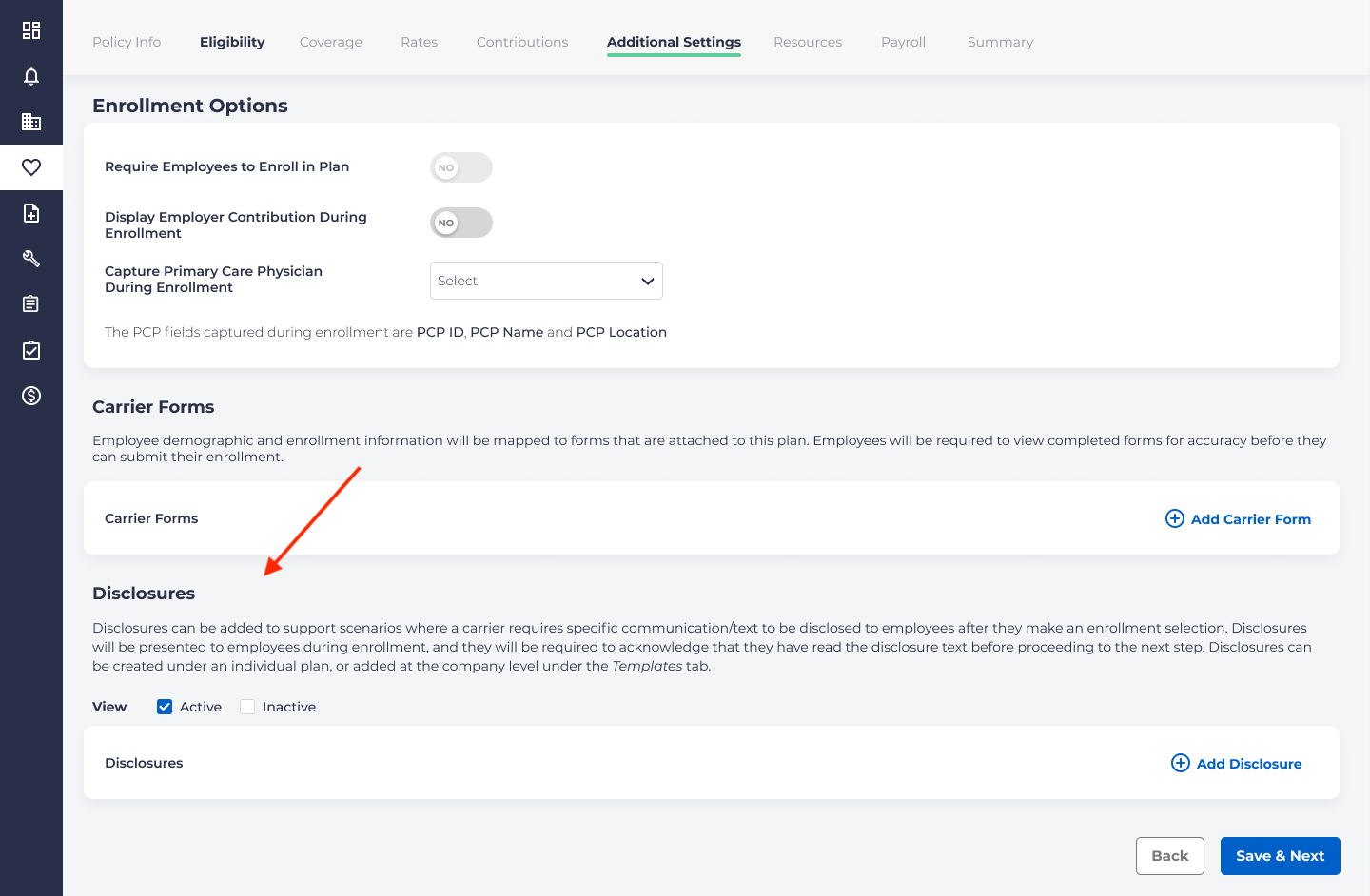 Under Benefits – Plans, choose the specific plan which needs to have a disclosure associated with it. Select the “Additional Settings” tab. A section on Disclosures is near the bottom of the page.